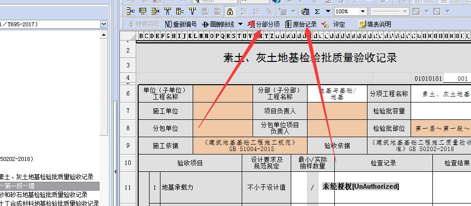 把檢驗(yàn)批填寫完成以后,檢驗(yàn)批表頭上面有個(gè)【分部分項(xiàng)】匯總,單擊這里就能生成